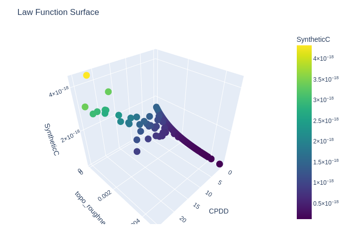 fig = plot_law(prediction.model.iceflow.C, prediction, law_inputs, nothing);Since we are in the documentation it is not possible to have an interactive plot but if you reproduce this example locally, you can run the line above without ";" and you can skip the lines hereafter. This will open an interactive window with a 3D plot that you can rotate.